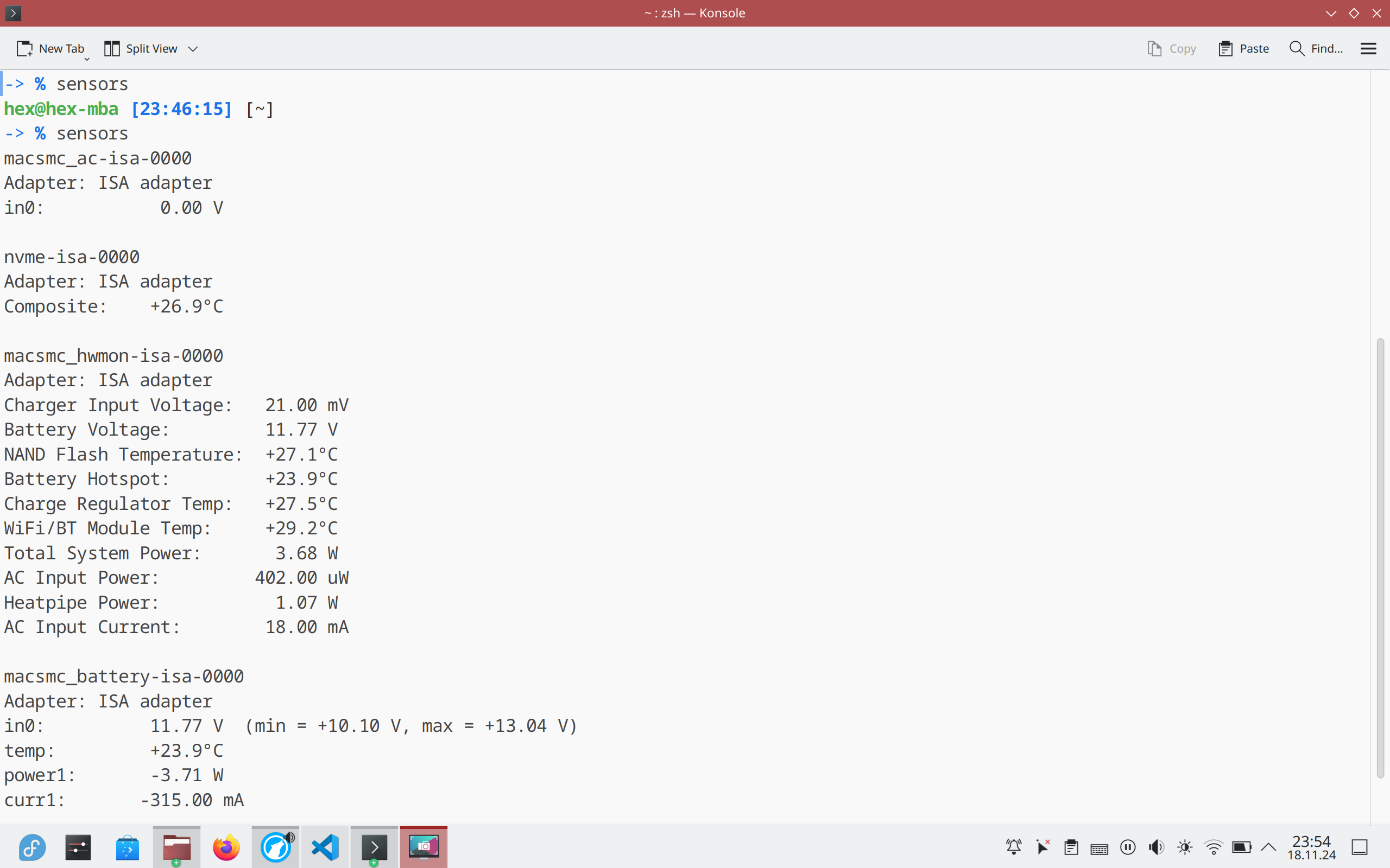 I was honestly quite surprised at how usable it was in general, the only thing I still would very much like to see implemented is the ability to connect an external monitor through one of the USB-C ports of the MBA — that has (as of the publishing of this post) not yet been implemented. Other than that, however, everything worked pretty much as you’d expect: you can change the brightness of the keyboard and the screen; the trackpad works (and even has force feedback); the speakers work and sound as you would expect them to sound; the keys on the keyboard all work (including things like the media keys for playing/pausing videos or music); closing the lid makes the laptop reliably go to sleep and opening it wakes it up quite quickly … you get the idea. Even the battery life is as fantastic (KDE estimating 9-12 hours) despite this MacBook being 4-ish years old now. WiFi also works perfectly and at the the expected speed.