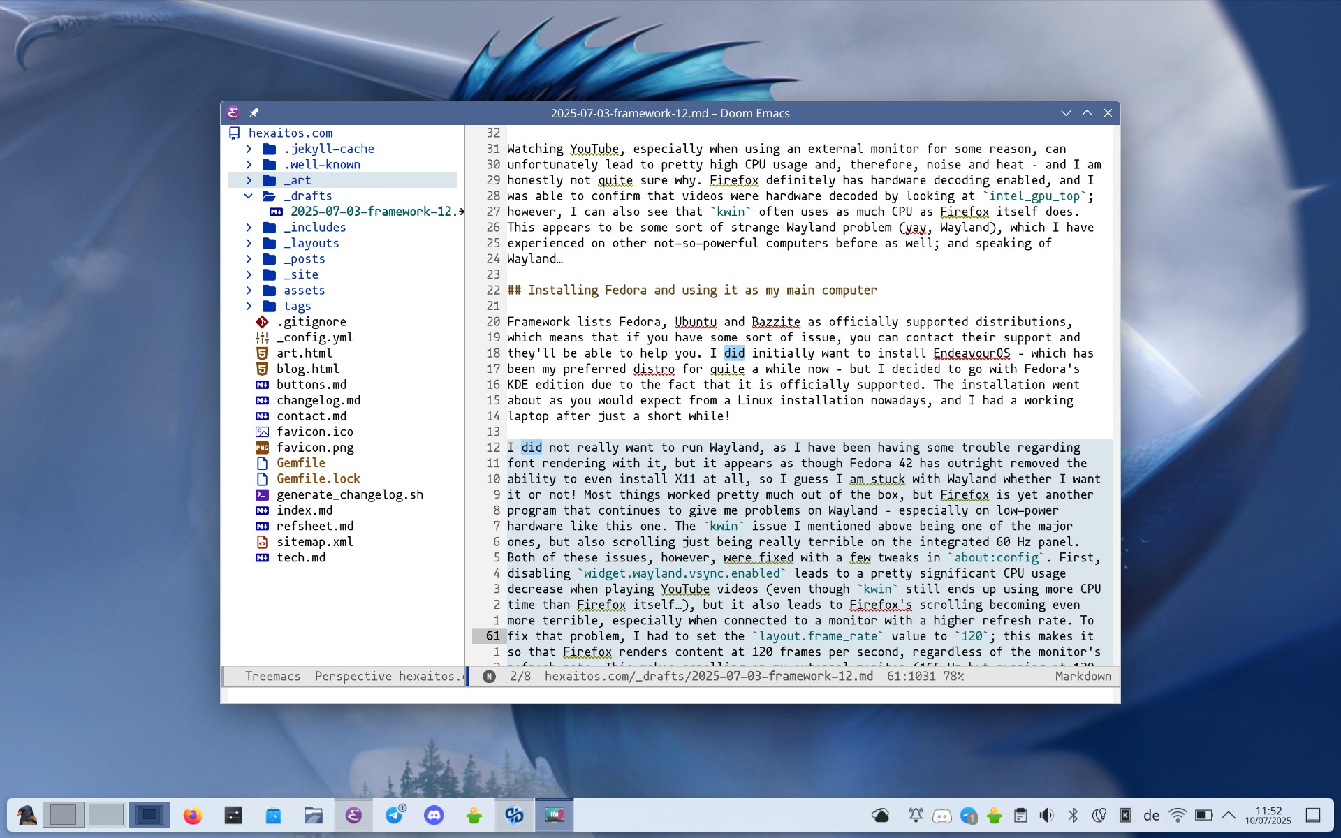 I did not really want to run Wayland, as I have been having some trouble regarding font rendering with it, but it appears as though Fedora 42 has outright removed the ability to even install X11 at all, so I guess I am stuck with Wayland whether I want it or not! Most things worked pretty much out of the box, but Firefox is yet another program that continues to give me problems on Wayland – especially on low-power hardware like this one. The kwin issue I mentioned above being one of the major ones, but also scrolling just being really terrible on the integrated 60 Hz panel. Both of these issues, however, were fixed with a few tweaks in about:config. First, disabling widget.wayland.vsync.enabled leads to a pretty significant CPU usage decrease when playing YouTube videos (even though kwin still ends up using more CPU time than Firefox itself…), but it also leads to Firefox’s scrolling becoming even more terrible, especially when connected to a monitor with a higher refresh rate. To fix that problem, I had to set the layout.frame_rate value to 120; this makes it so that Firefox renders content at 120 frames per second, regardless of the monitor’s refresh rate. This makes scrolling on my external monitor (165 Hz but running at 120 Hz via HDMI) a lot smoother and even helps a ton with the scrolling smoothness on the internal screen as well.